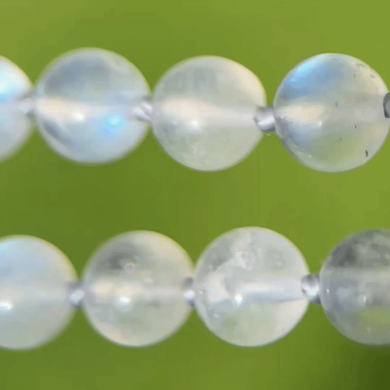 Su brillo azulado y flotante, la adularescencia, no es un tratamiento ni un efecto artificial: es un fenómeno óptico único que ocurre naturalmente dentro de la piedra y varía en cada pieza.